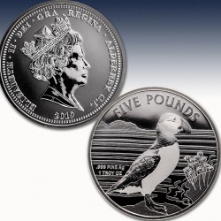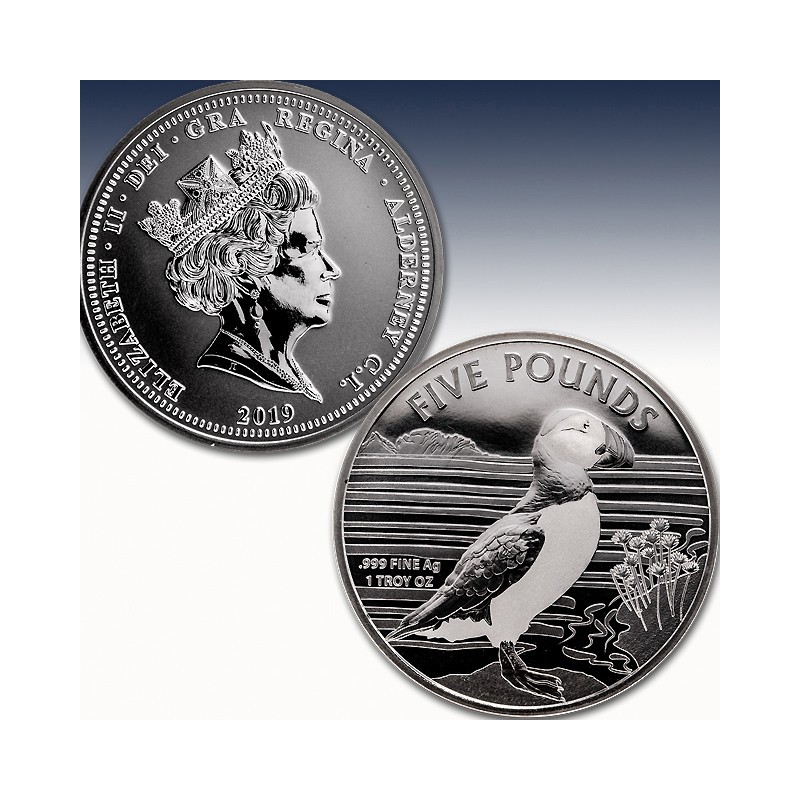 This release of the Alderney Five Pounds features a striking image of a Puffin in .999 fine Silver.