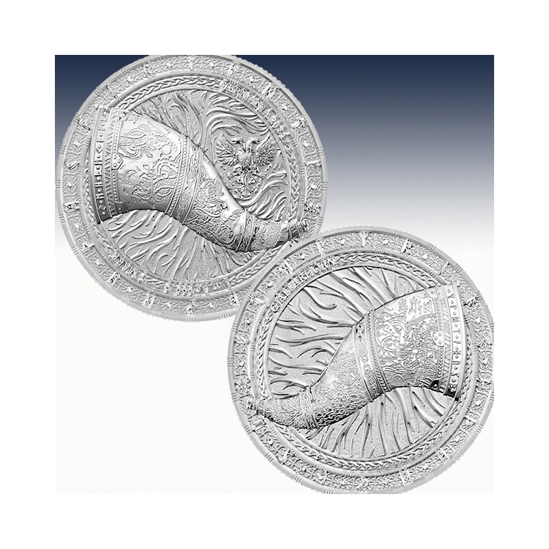 The horn features selected stories related to Ragnarök, the epic end of the world. The obverse depicts the arrow that killed Baldur, as well as the ship Loki took to Yggdrasil to engage in the final battle with the gods. This imagery also portrays brave warriors sent by Odin, struggling against a monster that symbolizes chaos and destruction.