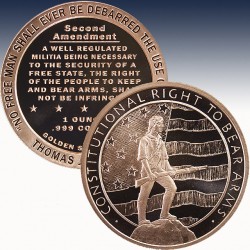 The reverse of each round the center of the round is inscribed with "A well-regulated militia, being necessary to the security of a free state, the right of the people to keep and bear arms, shall not be infringed." and stamped with the weight and purity of the round. The outer rim is in inscribed with "NO MAN SHALL EVER BE DEBARRED THE USE OF ARMS," THOMAS JEFFERSON". This round produced by Golden State Mint is mint fresh and is a great gift for the politically conscious or the gun lover in your life.