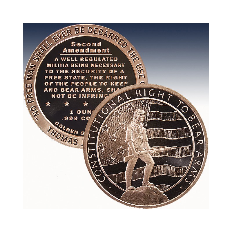 The obverse of each round is inscribed with the words CONSTITUTIONAL RIGHT TO BEAR ARMS, along with the patriotic image of a forefather holding a rifle. The American flag is waving behind him.