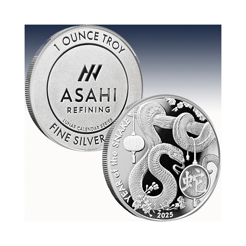 All 2025 1 oz Asahi Lunar Snake Silver Rounds available here come packaged in protective flips. These 1 oz silver rounds are the only rounds available in the Asahi Lunar Calendar Series. This collection also features 1 Gram, 2.5 Gram, and 1 oz gold bars, as well as a 1 oz silver bar.