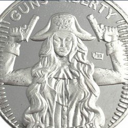 The obverse of Constitutional Open Carry Washington Silver Rounds features a woman wearing traditional Revolutionary War garments and holding two firearms. The design is augmented by a series of bullets lined up along the rim. Included on the obverse are inscriptions reading Guns, Liberty, and Coffee. There is also an outline of the state of Washington in the background.