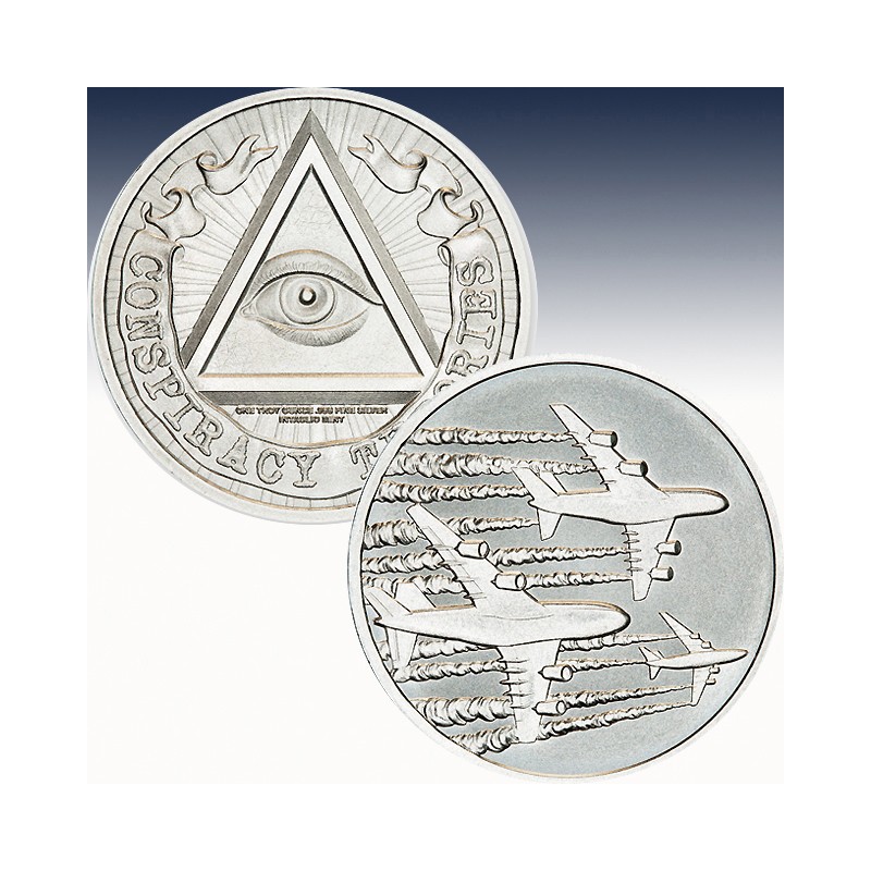 Is it just condensation… or a covert climate-altering agenda? This 39mm silver round dives straight into the hazy skies of speculation, depicting a dramatic flyover of jumbo jets leaving thick plumes in their wake. Whether you call them contrails or chemtrails, this piece is a nod to one of the most persistent (and polarizing) theories out there.