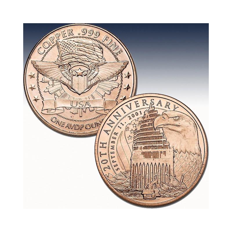 These 1 oz AVDP Copper rounds commemorate the 20th anniversary of September 11, 2001.