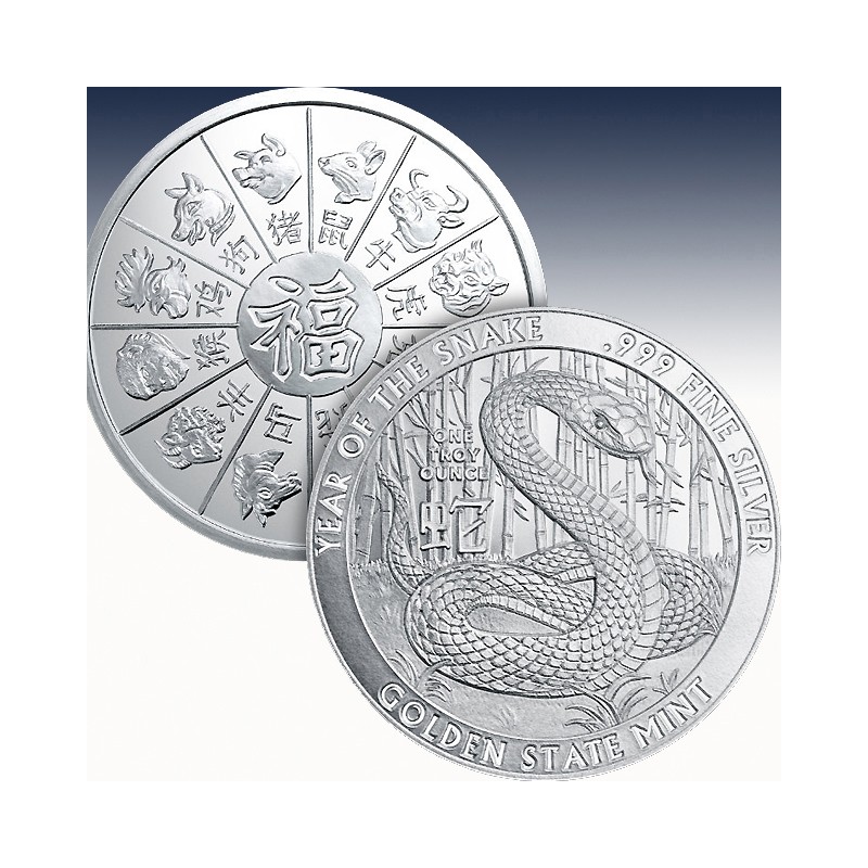 The front face (obverse) of the Year of the Dragon displays an elaborate Chinese dragon, with the Chinese symbol for dragon. On the rim of the round you can find the round’s purity and size noted with “One Troy Ounce” and “.999 Silver”. “Golden State Mint” at the bottom.