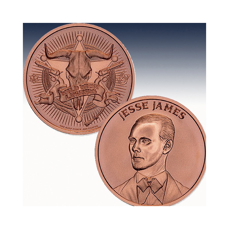 This 1 oz AVDP round is struck in .999 fine copper and measures 39mm. The obverse depicts Jesse in a refined pose, dressed in a bow tie and suit—an image of outward civility that masked a life of crime. The reverse features the series hallmark: a weathered longhorn skull with Western ornamentation.