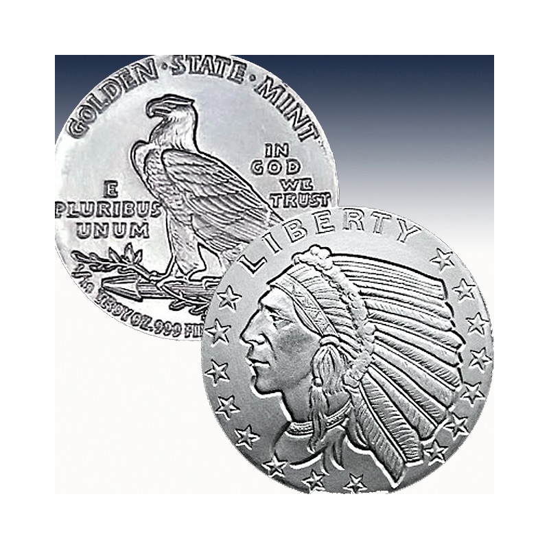 Patterned after the $2.50 & $5.00 Indian Head Gold Coin Minted from 1908 to 1929, our famous .999 Fine Silver Incuse Indian round is now available in fractional ounces of silver. With uncertain economic times and silver prices on the rise, multiple denominations of bullion are highly desired. The Golden State Mint is proud to offer our fractional silver line in mint fresh 1/10 troy ounce .999 Fine Silver rounds.