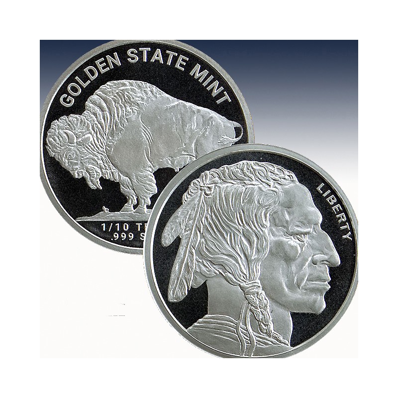 The obverse (front) of the round depicts a Native American with the motto ”LIBERTY” on top right. The reverse (back) of the rounds depicts a standing American bison (buffalo) atop a mound of dirt. Supposedly, the bison was modeled after "Black Diamond" in the New York Central Park Zoo. The rounds are hallmark stamped with their weight, purity and Golden State Mint and have a reeded edge. Golden State Mint offers mint fresh beautifully struck, one tenth (1/10) troy ounce silver rounds. These rounds are and excellent way to buy silver and are easily stacked, stored and are perfect for investors and collectors alike.