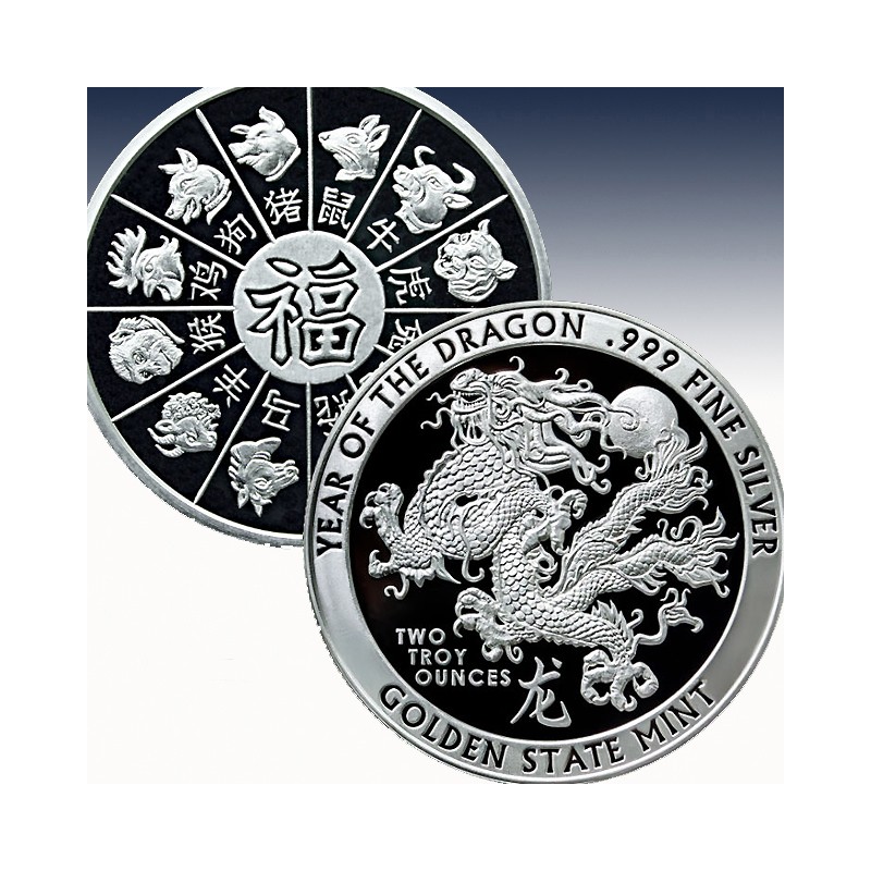 The front face (obverse) of the Year of the Dragon displays an elaborate Chinese dragon, with the Chinese symbol for dragon. On the rim of the round you can find the round’s purity and size noted with “Two Troy Ounces” and “.999 Silver”. “Golden State Mint” at the bottom.