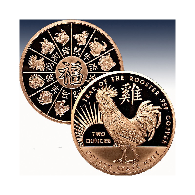 Golden State Mint loves a celebration, and this newest Year of The Rooster round is a perfect way to recognize and celebrate the 2017 Chinese Lunar New Year. Made from 1 troy oz of .999 fine copper, these attractive rounds capture finely detailed artwork.