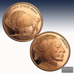 Golden State Mint Buffalo Rounds are brand new non-circulated copper rounds with a rendition of James Earle Fraser's classic design of the Buffalo Nickel issued in 1913. Generally, Fraser's Indian Head nickel design is regarded as among the best designs of any U.S. coins.