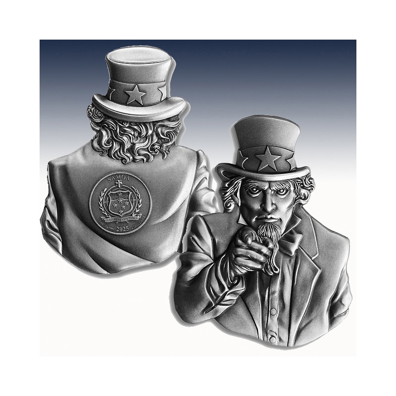 All 2025 2 oz Samoa Silver Uncle Sam Shaped Coins are available here with individual packaging. The coins are struck in high relief with a shape that reflects historic representations of Uncle Sam. The coins have an antique polish throughout and come with a presentation case that includes a Certificate of Authenticity.