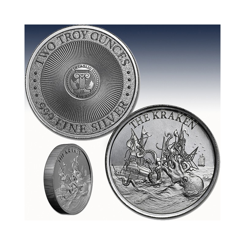 This 2 oz .999 fine Silver round is part of the Cryptozoology series, which features a highly detailed image of a Kraken.