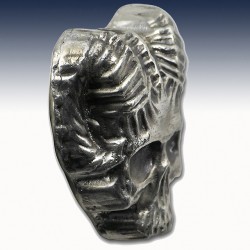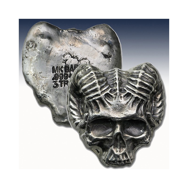 This 3 oz .999 fine Silver round has been carefully hand poured and hand-stamped. Each bar features a design of a Demon Ram Skull that gives you a unique look and feel, while adding an appeal of collectibility to your holdings.