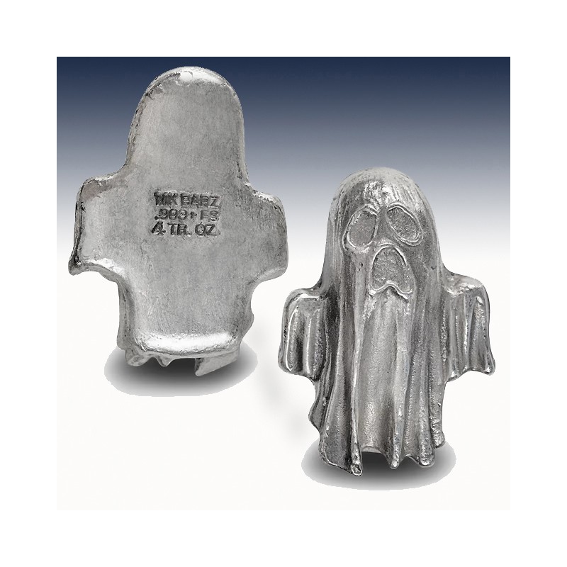 Each order of the 4 oz MK Barz Hand Poured Ghost Silver Bar will arrive in a protective plastic bag to preserve the quality of your silver. Each bar is shaped like a ghost and contains 4 Troy oz of silver. These bars were created by using an open-face sand casting technique.
