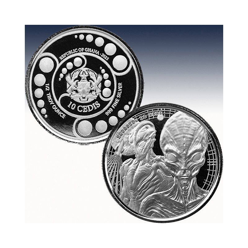 Embark on an otherworldly journey with our 1/2 troy oz silver proof like Alien coin, capturing the intrigue of an imminent invasion and battle ready aliens.