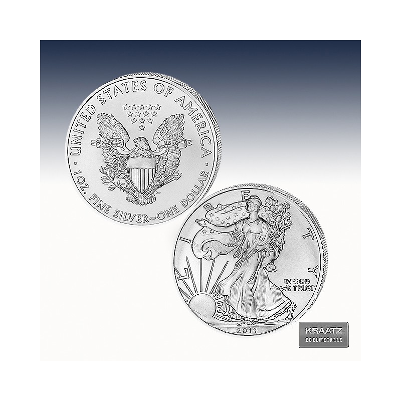 Auf der Vorderseite der Münze befindet sich ein Abbild des Weißkopfseeadlers - das amerikanische Wappentier. Dieser Weißkopfseeadler trägt im Schnabel ein Spruchband mit den Worten E Pluribus Unum - aus dem Lateinischen stammend bedeutet es übersetzt Aus den Vielen Eins. Gemeinsam mit den 13 Sternen, die sich ebenfalls auf der Vorderseite der Amerikanischen Silber Münze befinden, symbolisiert dieser Spruch die Gründung der Vereinigten Staaten von Amerika. Eben diese Gründung fand gemäß der Unabhängigkeitserklärung vom 04.Juli 1776 mit den britischen Kolonien Connecticut, Delaware, Maryland, New Hampshire, Massachusetts, Georgia, New Jersey, Virginia, South Carolina, North Carolina, Rhode Island, Pennsylvania sowie New York statt. Diese Motiv wurde entworfen von John Mercanti.
