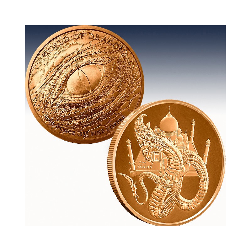 On the obverse face, 1 oz Copper World of Dragons The Indian Rounds feature a traditional Eastern depiction of the dragon. Cultures across the Indian Subcontinent and Asia often depicted dragons as snake-like creatures, as opposed to the flying beasts of European cultures. This long, powerful dragon guards the Taj Mahal in this design. The Taj Mahal was built between 1632 and 1653 by the Mughal emperor Shah Jahan for Mumtaz Mahal, his favorite wife.
