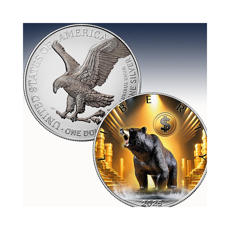 Diese Ausgabe der American Silver Eagle Serie wurde aus einer Unze 99,9% Silber geprägt und trägt den Titel "Bitcoin - Bär". Das farbige Motiv präsentiert im Vordergrund eine strahlende Erscheinung eines goldenen Bären, während im Hintergrund die Krypto-Währung "Bitcoin" abgebildet ist. Der Bär steht repräsentativ für den sogenannten "Bärenmarkt", von dem in der Börsensprache die Rede ist, wenn es bei Kryptowährungen, Aktien oder anderen Vermögenswerten um sinkende Kurse geht. Die Aufschriften "LIBERTY" und "2024" sind ebenfalls Bestandteil des Designs. Die Rückseite präsentiert den amerikanischen Weißkopfseeadler mit einem Eichenzweig in seinen Klauen. Umrahmt wird das Adler-Design von den Worten "UNITED STATES OF AMERICA", "ONE DOLLAR - 1OZ. FINE SILVER". Die Lieferung der limitierten 2025er Silver Eagle - Bitcoin - Bär Silbermünze erfolgt in einer schützenden Münzkapsel inklusive zugehöriger Produktkarte.