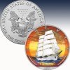 Das Motiv der Silver Eagle Münze präsentiert eine farbige Darstellung der Gorch Fock mit gehissten Segeln und deutscher Flagge.