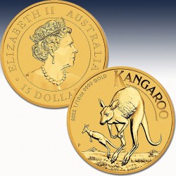 Diese bei Sammlern beliebte, 1 Dollar GoldKangaroo Münze wurde zum ersten Mal im Jahre 1993 von der Royal Australian Mint geprägt und herausgegeben. Diese 1 Unze aus Gold besticht durch ihr jährlich wechselndes Känguru-Motiv. Erst seit 2008 offiziell als Australian Kangaroo benannt, wird diese seit 1987 von der Perth Mint geprägte australische Münze auch als Nugget bezeichnet. Bis 1989 war auf der Vorderseite ein Nugget und anschließend das australische Känguru abgebildet. Auf Rückseite ist eine Abbildung von Königin Elisabeth II. Der Kangaroo ist in Australien als gesetzliches Zahlungsmittel mit einem Nennwert von 15 AUD zugelassen.