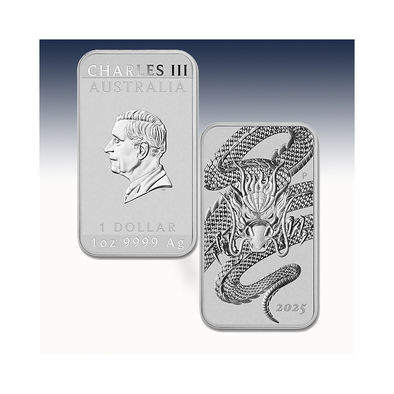 The 2025 Australia 1 oz Silver Rectangular Dragon features a unique rectangle format, and is offered at a bullion price point. Add the unique Rectangular Dragon coin from The Perth Mint to your cart today!