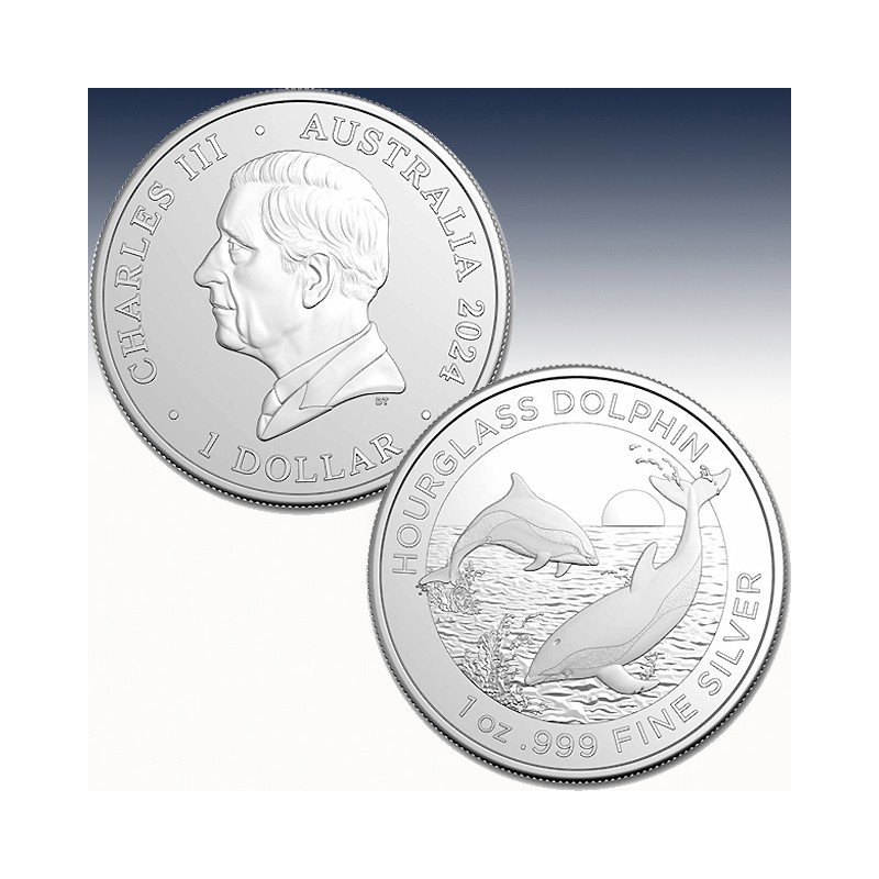 Dolphin SeriesThe dolphin is a beloved animal depicted in many cultures, and is also native to Australian waters. Royal Australian Mint and APMEX partnered to release the Dolphin series in both gold and silver. In various cultures, the dolphin symbolizes happiness, power and protection. Hourglass dolphins are a relatively small species of dolphins and are found in Arctic waters, as they prefer colder water and spend most time closer to the surface. The hourglass dolphin is colored black on top and white on the belly, with white patches on the sides. They are often found in smaller groups of 10-15 dolphins and can be seen bow-riding waves from ships and baleen whales.