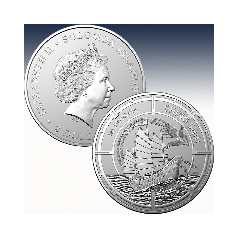 Ein majestätischer Phönix zeichnet mit seinem Schweif einen Kreis um das Schiff. Die Aufschrift "CHING SHIH" sowie Gewicht und Feinheit komplettieren das Design.