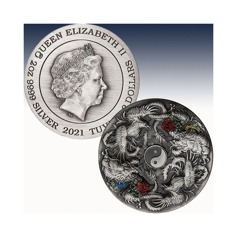 Diese randlose Münze aus der Serie Chinesische Fabelwesen wurde von der Perth Mint aus zwei Unzen 99,99% reinem Silber geprägt und zeigt zwei Drachen und zwei Phönixe, die um das Yin-Yang Symbol herum angeordnet sind.