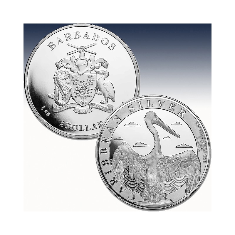This Caribbean Pelican has a limited mintage of 10,000 coins. This bullion Silver coin issued by the country of Barbados features one of the icons featured in the Barbados coat of arms, the pelican.