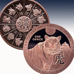 The front face (obverse) of the Year of the Tiger displays a Tiger, with the Chinese symbol for tiger. On the Rim of the round you can find the round’s purity and size noted with “ One Ounce” and “.999 Fine Copper”. “Golden State Mint” at the bottom.