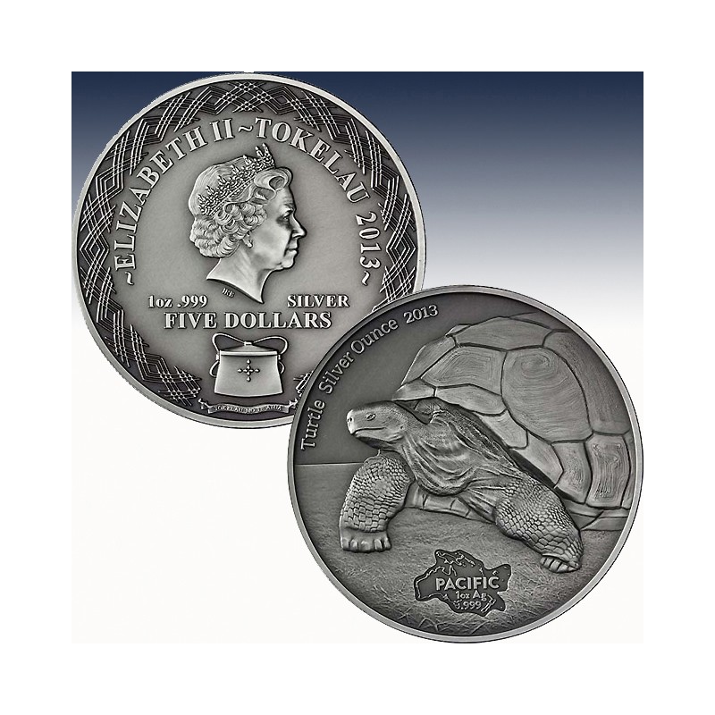 Eine riesige Landschildkröte dominiert das Motiv dieser tollen Silberunze. Neben dem Motiv, am Rand der Münze, steht "Turtle Silver Ounce 2013". Unterhalb der Schildkröte ist das Markenzeichen der „Pacific 1 Oz Ag .999" zu finden.Auf der Wertseite der 1oz Silbermünze ist Königin Elizabeth II. zusammen mit dem Wappen von Tokelau abgebildet. Die Königin blickt auf die rechte Seite der Münze. Ihr lockiges Haar ist fein detailliert, und ihre Krone sticht durch das Antike-Finish hervor. Unter ihrem Hals befinden sich die Initialen "IRB", die Ian Rank-Broadley das Motiv zuschreiben. Die Plakette unter ihrem Porträt zeigt eine Tackle-Box, die bei Fischern in der Region beliebt ist. Der christliche Einfluss auf das Gebiet wird durch das Kreuz auf der Schachtel symbolisiert. Unter der Box befindet sich eine Schriftrolle mit der Aufschrift "TOKELAU MO TE ATUA", was übersetzt "Tokelau für Gott" bedeutet. Entlang der Unterseite der Münze befindet sich eine Inschrift, die den Nennwert und den Metallgehalt der Münze angibt. Es lautet: "FIVE DOLLARS – 1 oz. 999 SILVER." Die Königin ist oben links mit der Aufschrift "ELIZABETH II" gekennzeichnet, während sich "TOKELAU", das die Silbermünze ausgegeben hat, in der oberen rechten Seite befindet.