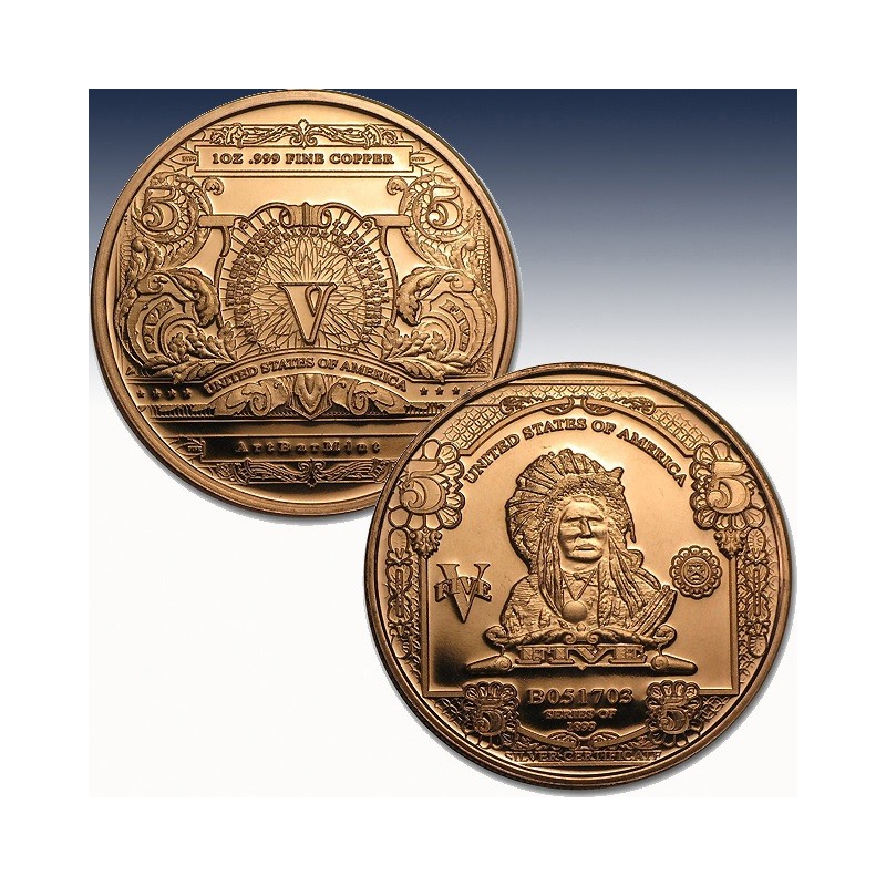 This 1 AVDP oz Copper Indian Banknote round pays tribute to the 1899 $5 Indian Chief Oncpapa Sioux Silver Certificate. Each Copper round offers this classic design in an affordable 1 AVDP oz Copper size.
