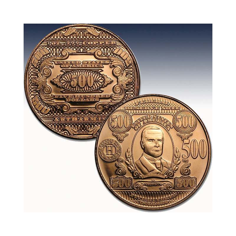 The $500 banknote paying tribute to William McKinley, the 25th president of the United States, was created in 1934. These 1 AVDP oz Copper rounds honor the large-denomination banknotes in an affordable way.
