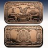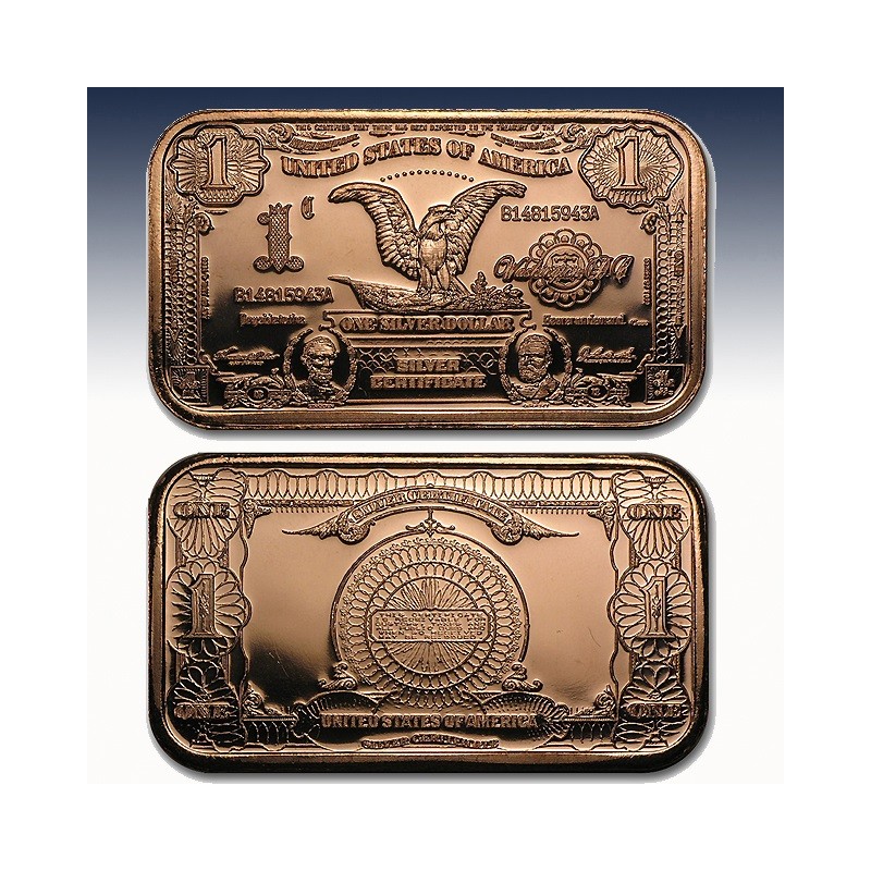 This 1 AVDP oz Copper bar pays tribute to the 1899 $1 Black Eagle Silver Certificate, which was the only U.S. currency to feature the images of two different presidents. These bars provide this unique design at a low price point.