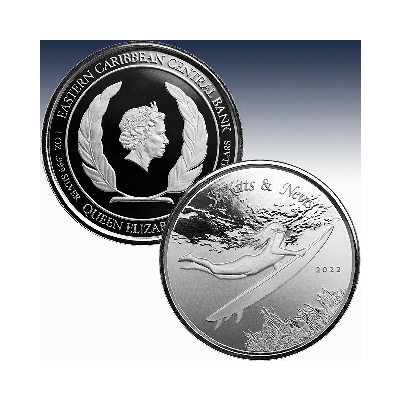 1 x 1 Unze (oz) Silbermünze 2$ St.Kitts&Nevis "8# Underwater Surfer 2022"