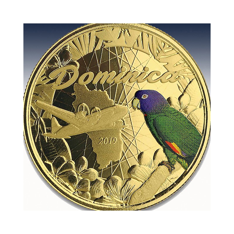 The 2019 ECCB Dominica coin features the island's indigenous Sisserou Parrot, accompanied by an airplane mid-flight over the island of Dominica. The coin's image captures the essence of Dominica, a lush utopia that ferries weary travelers to another time. Officially known as the Commonwealth of Dominica, the island paradise is affectionately regarded as "The Nature Isle" thanks to its stunning tropical vistas and volcanically heated, steaming lake. Boasting some of the Caribbean's best hiking and diving, Dominica is a "must-visit" destination for individuals looking to bask in nature's bounty and relax under the warm Caribbean sun!