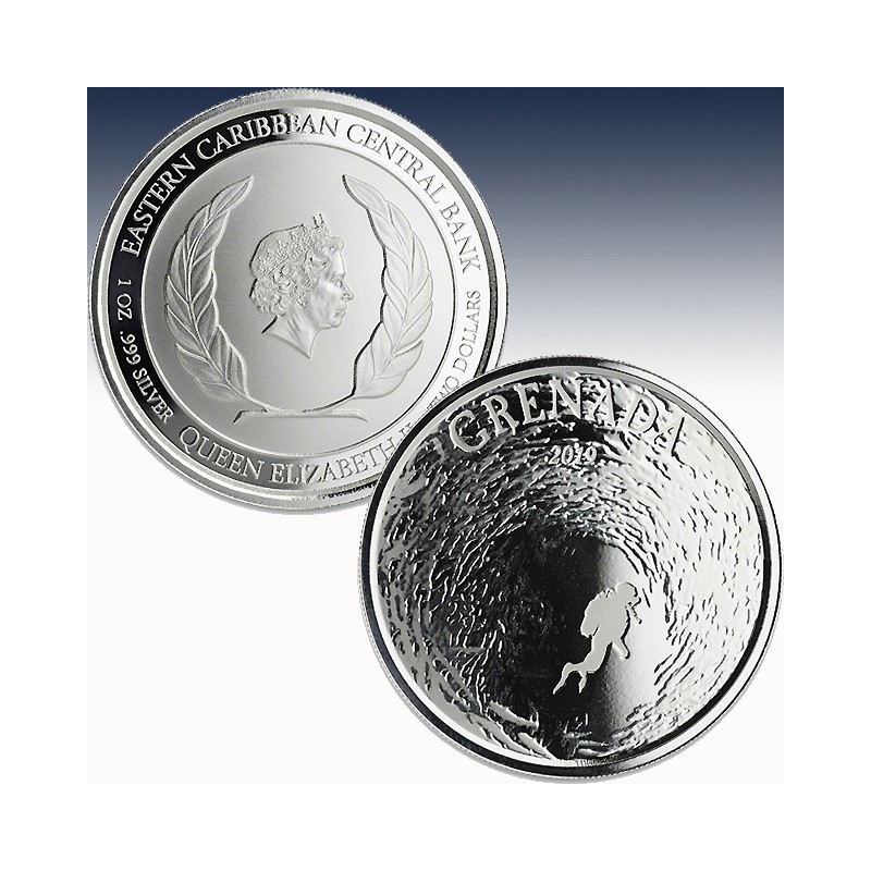 The 2019 ECCB Grenada Diving Paradise 1 oz Silver and 1 oz Gold coins depict a lone scuba diver encircled by a massive school of rainbow runners - fish known for subtropical migrations through the West Indies. Grenada is most often described as a scuba diver's paradise - it is blessed with an abundance of shipwrecks, reefs, walls, and underwater sculpture parks. These features allure divers interested in immersing themselves within large schools of pelagic fish species including jack, creole wrasse, and rainbow runners.