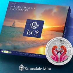 This year’s EC8 release for Saint Lucia captures that spirit through the graceful imagery of two flamingos, poised in mirrored reflection. With curved necks gently arching toward one another, the birds form a symbol of harmony and balance — a visual echo of the island’s peaceful rhythm and interconnected ecosystems.