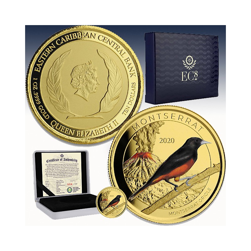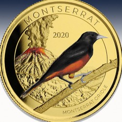 The 2020 ECCB Montserrat coin depicts the Montserrat Oriole, a vulnerable species of oriole endemic to this eastern Caribbean island. In stunning detail, the national bird of Montserrat is shown perched on a branch against a backdrop of the famous Soufriére Hills volcano. As of 1995, Soufriére Hills is an active volcano. Frequent eruptions have left half of the island uninhabitable and have also contributed to the Montserrat Oriole's status as a vulnerable endangered species. Between 1995 and 2000, two-thirds of the island's population was forced to flee, primarily to the United Kingdom, leaving fewer than 1200 people on the island in 1997. The volcano exists within an exclusion zone which is not accessible to the public, yet the rest of the island remains one of the Eastern Caribbean's highly sought tourist destinations.