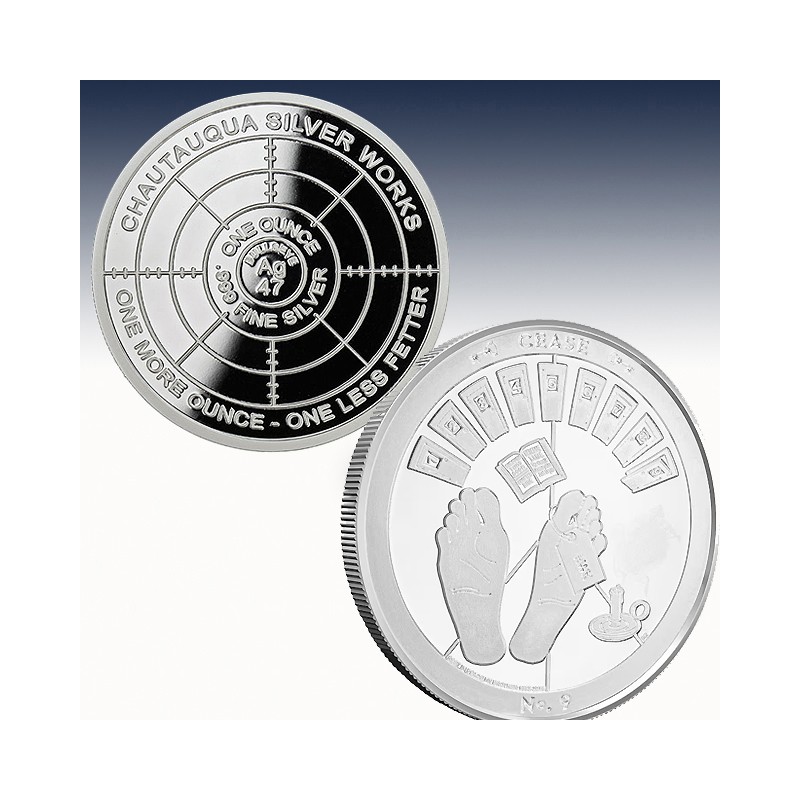 The Chautauqua Silver Works logo is found on the reverse side of 1 oz Silver Cease Rounds. This logo comes with a bullseye design throughout that includes the mint logo, along with inscriptions of the weight, purity, and metal content of the round.