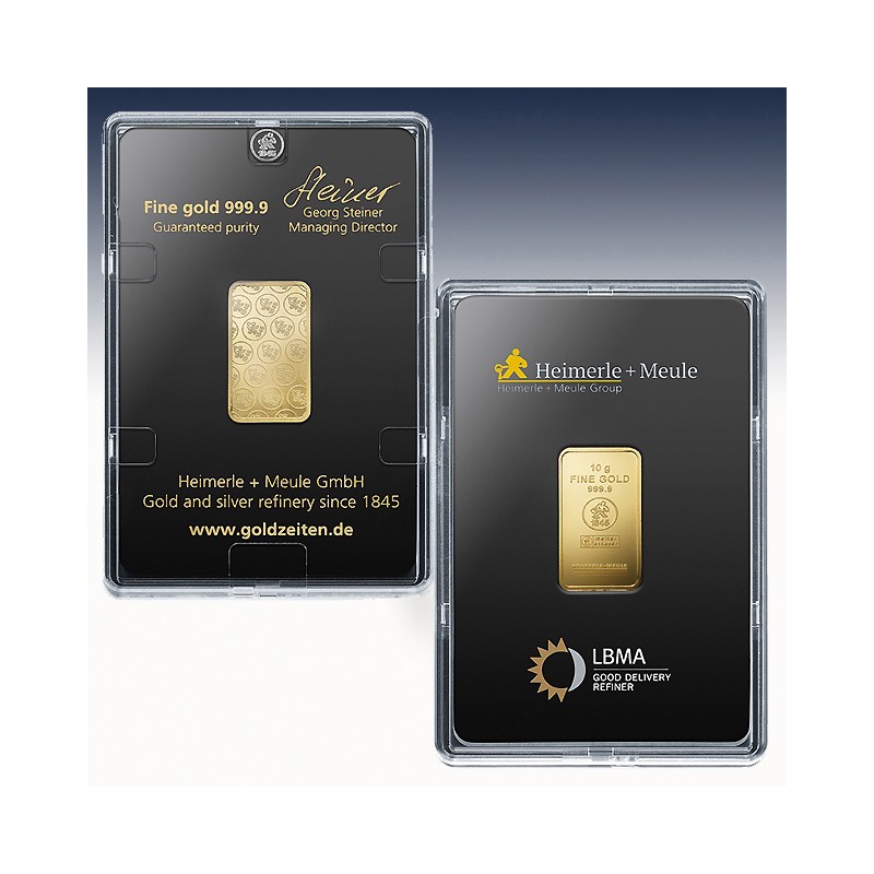 Zu 999,9/1000 besteht der 10 Gramm Goldbarren "Heimerle+Meule"