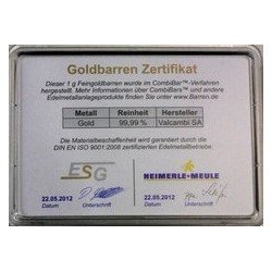 Direkt neben dem Motiv ist der 1 Gramm Goldbarren eingelassen, welcher sich in einer ESG genormten CombiBar-Kapsel befindet und von der Prägeanstalt VALCAMBI SA aus der Schweiz hergestellt wird.