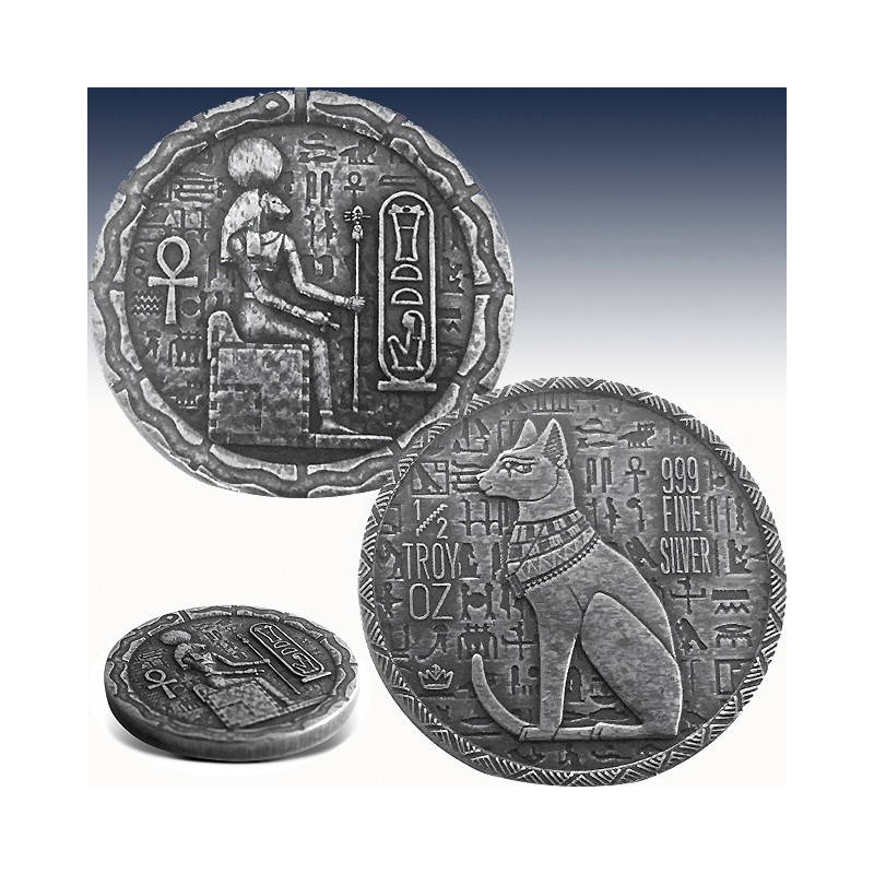 Bastet is the focus on the design on these 1/2 oz Silver Rounds from Monarch Precious Metals. Bastet, also known as Basta, was a goddess in Ancient Egyptian religion who was worshiped during the Second Dynasty around the year 2890 BCE. Prior to the unification of various Egyptian cultures, the people of Lower Egypt living in the Nile River delta region knew Bastet as a goddess of warfare.