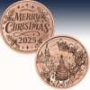 The obverse portrays a breathtaking holiday scene: Santa’s sleigh gliding high above a snow-covered village, guided by his loyal reindeer beneath a starry sky. Below, townsfolk gather around a towering Christmas tree, surrounded by storybook rooftops and distant winter peaks — a nostalgic snapshot of Christmas spirit brought to life in warm copper tones.