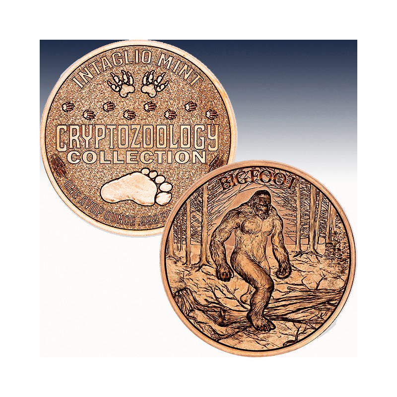 Struck in .999 fine copper, this 1 oz AVDP round measures 39mm and features a highly detailed depiction of Bigfoot mid-stride through dense woodland, inspired by the famous Patterson–Gimlin frame. His muscular build, shaggy fur, and piercing gaze give life to the myth, while towering trees and rugged terrain root him in his natural, untamed habitat. The reverse carries the signature Cryptozoology Collection design — a sequence of varied tracks, including claw and paw prints, crowned by a bold footprint and the Intaglio Mint name.