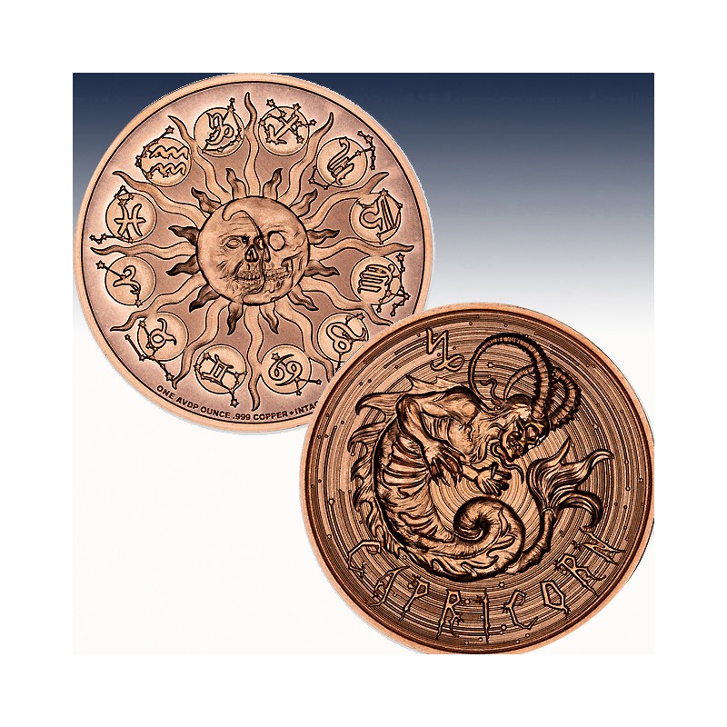 This 1 oz .999 fine copper round drags Capricorn, the sea-goat of the zodiac, from myth into macabre. Half decayed goat, half monstrous fish, this creature slithers upward from the depths of death—ambitious even in the afterlife. No mountain’s too high. No abyss too dark.