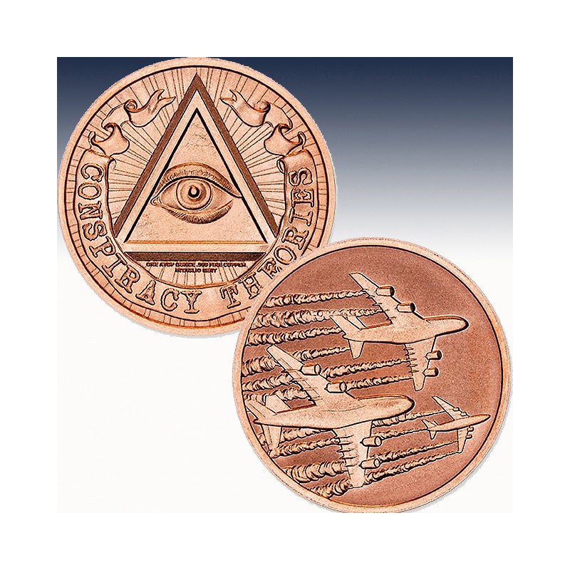Is it just condensation… or a covert climate-altering agenda? This 39mm copper round dives straight into the hazy skies of speculation, depicting a dramatic flyover of jumbo jets leaving thick plumes in their wake. Whether you call them contrails or chemtrails, this piece is a nod to one of the most persistent (and polarizing) theories out there.