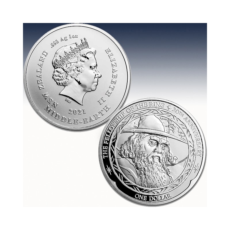 Celebrating the 20th Anniversary of Lord of the Rings in the Fellowship series, this Silver coin in Brilliant Uncirculated condition has a mintage of only 10,000.