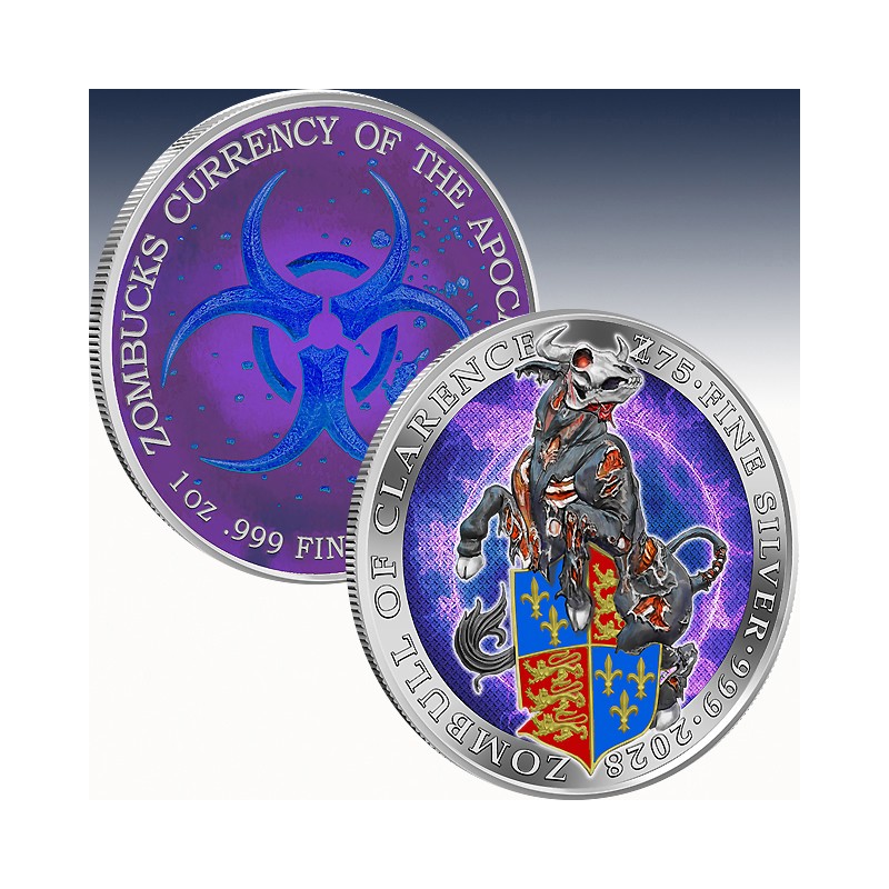 Displayed on the obverse of the Colorized Zombucks World Zombull Silver Round is a rotting interpretation of the royal bull. Still holding a shield, the bull’s decomposing form and the shield’s cracks serve as a stark reminder that even traditional symbols of strength and wealth are no match for a zombie apocalypse.